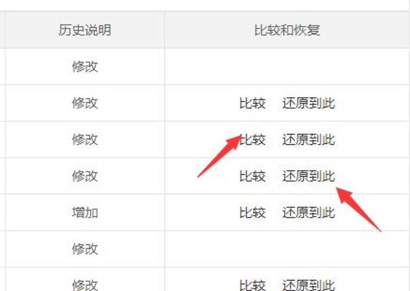 在相关文章列表的右侧,可以点击比较查看文章历史节点中的内容与当前文章内容的差别。有区别的项目将显示为红色。点击还原到此,将进行文章恢复操作。